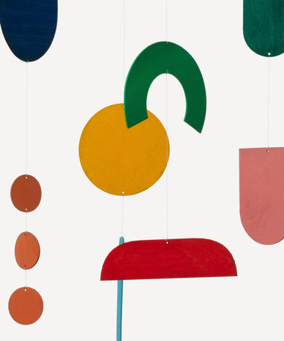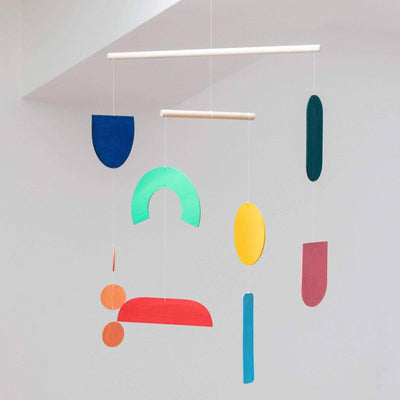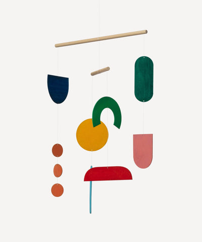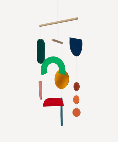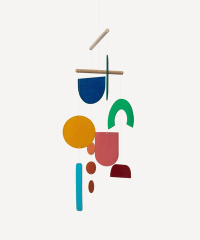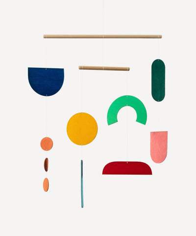 This mobile brings you joy and inspiration. The slightest breeze makes the forms rotate and the shapes move and play in space. Constructed with laser cut wood, the pieces are then painted and assembled by hand.