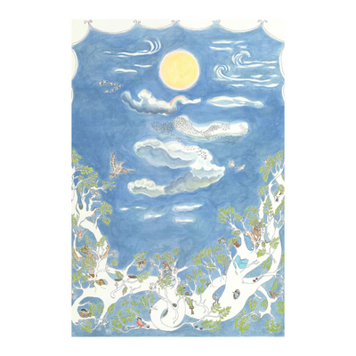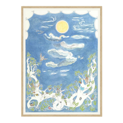Hand-drawn and painted by Forivor's Alice Ruby Ross this print is a love song to the air around us and all the creatures that inhabit it. Three children can be glimpsed among the large branches of an old ash tree, finding unfamiliar faces in the cloud formations and spotting birds.