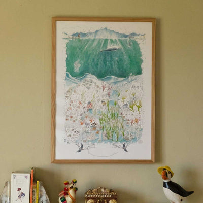 Hand-drawn and painted by Forivor's Alice Ruby Ross, this calm print features incredible fish, sea grasses, seals, whales and molluscs all based on incredible underwater wildlife found in Britain’s seas. As research for this design, we visited Anglesey Sea Zoo in Wales to learn about the wildlife in Britain’s coastal waters and to find inspiration of the characters.