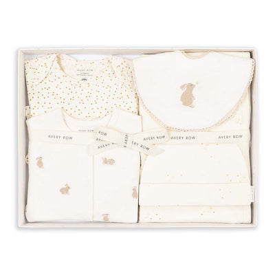 The perfect gift for the new baby in your world. Keep little ones cosy during sleep and stylish through the day with our new baby starter gift set, featuring sweet little bunnies and our delicate prints as part of the Chamomile collection. Made from the softest 100% organic cotton to be gentle on your babies skin. The perfect addition to babies wardrobe, this set is tied up in a bow and packaged in a box, making this the perfect gift.