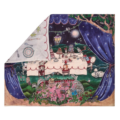 Our reversible swaddle takes families on a deliciously magical journey from day to night, featuring two hand-illustrated scenes filled with food, wonder, and the creatures of the hedgerow.In our Once Upon a Feast design, the daytime scene invites you to a whimsical afternoon tea party with treats foraged from gardens and hedgerows. Turning over your muslin reveals a nighttime starlit midnight feast where woodland animals including foxes, pine martens, hazel dormice and barn owls gather to celebrate under the constellations. There are beautiful details for both baby and parent to enjoy.