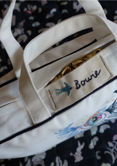 Your child's name or a short phrase of your choice will be hand-embroidered in Wales. We have developed a range of beautiful motifs to have next to your child's name. These include a swift or mushroom for the Enchanted Forest collection, a whale or shell for the Legends of the Sea designs and a privet hawk moth or snail for The Space Above the Ground.