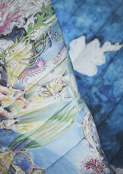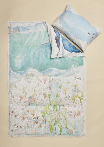 Forivor’s luxurious Legends of the Sea bedding is made from the softest rain‑fed organic cotton and inspired by British marine wildlife to take families on a journey from day to night. Designed in the UK, this reversible set features a calming seascape by day and a magical underwater world by night, hand‑illustrated on 318 thread count cotton satin to inspire storytelling and magical childhood dreams. An optional set of character cards helps children learn about the wildlife and imagine their own bedtime tales.Unpackaged option: Duvet cover and pillow slip presented in a Forivor ribbon.