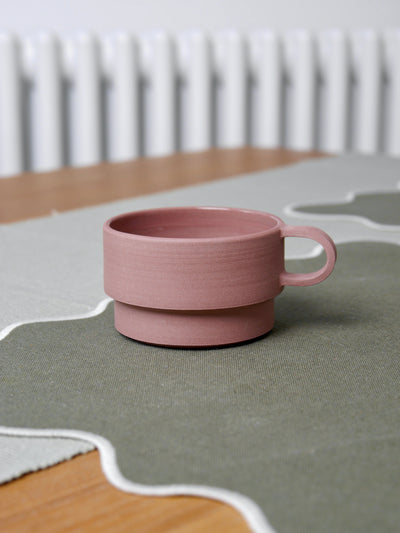 This angular mug is the perfect size for flat whites. Wheel thrown in a damson (mauve) clay, the tactile exterior is contrasted by the glazed gloss interior.