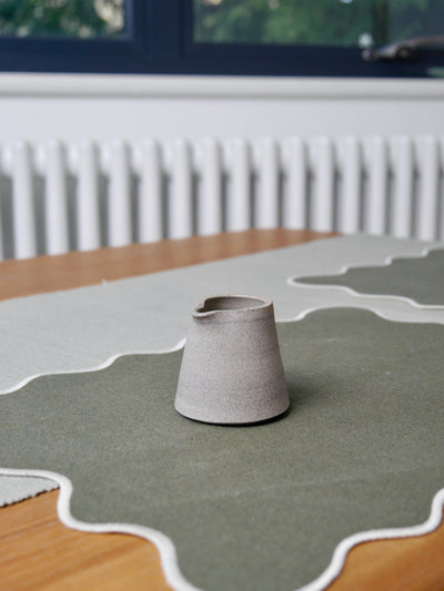 Wheel thrown in a stone grey clay, this ceramic jug is unique in texture and character. The unglazed, tactile exterior is contrasted by the glazed gloss interior.