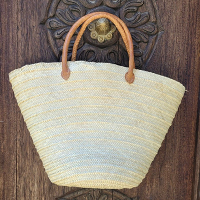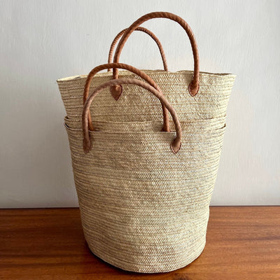 This durable, easy-to-carry basket is handmade from dried palm leaves, featuring intricate weaving and sturdy leather handles. Perfect for errands, picnics, or home storage for toys, blankets, or laundry. Its versatile size makes it an essential for your car, home, or weekend trips.