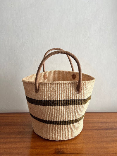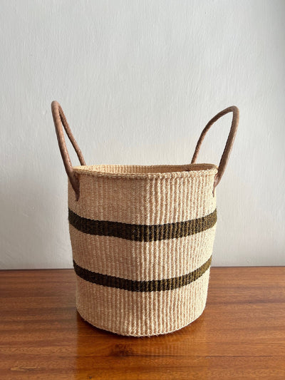 This olive and natural coloured storage basket is practical and highly durable. Handwoven using locally grown sisal, it is easy to carry around with its sturdy leather handles.