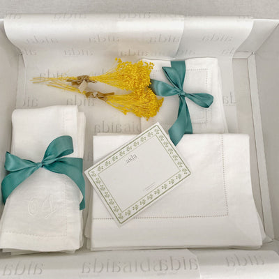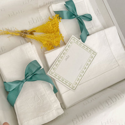 • 4 or 6 personalized linen napkins with hemstitch detailing