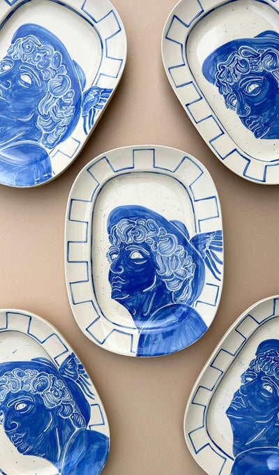 Decorative oval plate. Illustrated with the Roman God Mercury, painted in medium blue underglaze.