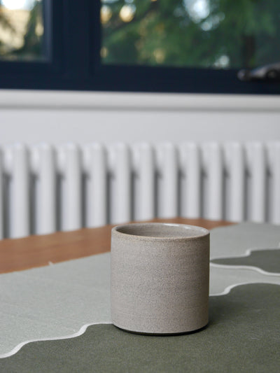 Wheel thrown in a grey stoneware clay, this ceramic cup is unique in texture and character. The unglazed, tactile exterior is contrasted by the glazed gloss interior.