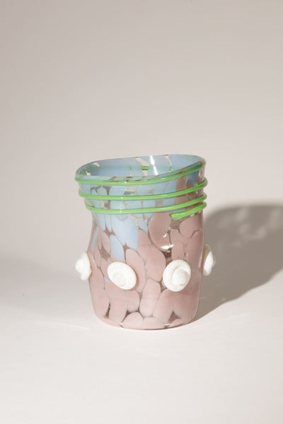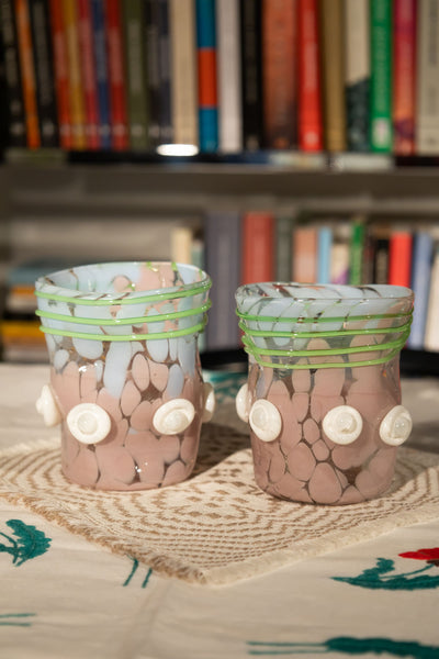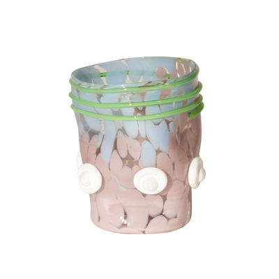 Each piece features an abstract, sculptural, rule-breaking shape inspired by Gaudí, brought to life through a playful mix of colours – light blue, lilac – and tactile, applied white and bright green 3D details. No two glasses are alike, every piece is entirely unique.
