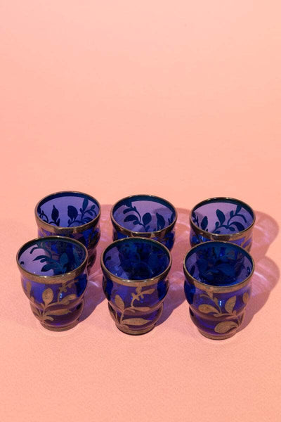 Hand painted with silver on cobalt blue glass in delicate floral patterns, it includes a carafe with a lid, and six shot glasses.