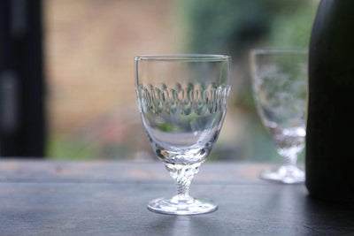 Each glass has been hand-blown and hand-engraved, with a short twisted stem.