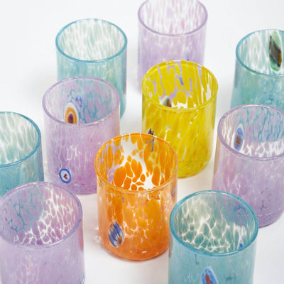 These beautiful mini glasses are hand blown by master glass blowers. Each on is truly one of a kind, accented with tiny murrina details.