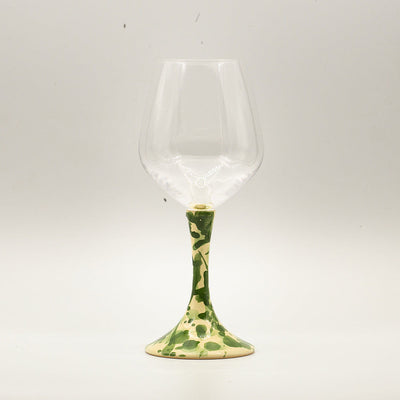 These wine glasses are truly one-of-a-kind with a whimsical combination of glass and ceramic splatter ware stem.  Characterised by a distinctive 2 tone Tuscan green on a soft yellow base splatter design, its versatile and simple shape will suit a variety of wines, any refreshing iced beverage, or before-dinner Italian Spritz.   All products are 100% lead free and approved for alimentary use.