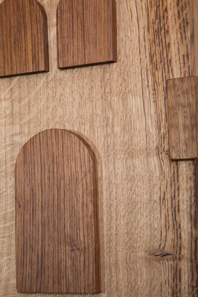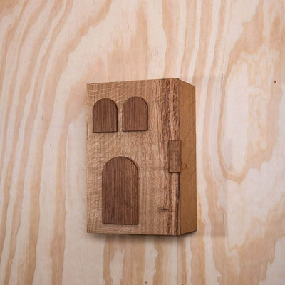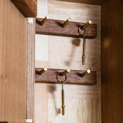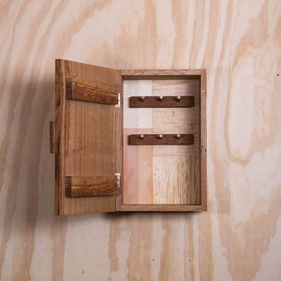 Charismatic key cabinet perfect for hallway storage. Hand made in my Manchester workshop using a variety of English Oak woods, and a fabulous patchwork veneer backboard.