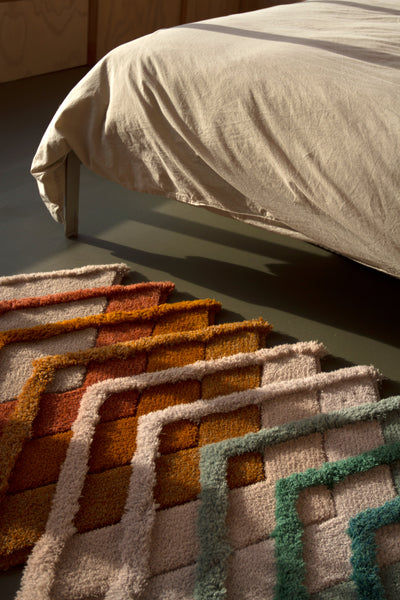 ‘Axo’ rug, is inspired by the architectural drawing technique called axonometric perspective or axonometry, which is a means of representing three-dimensional objects within a 2D projection. The repetitive geometric motifs and colours travel across the rug to create a spectrum of depth, and vibrancy.