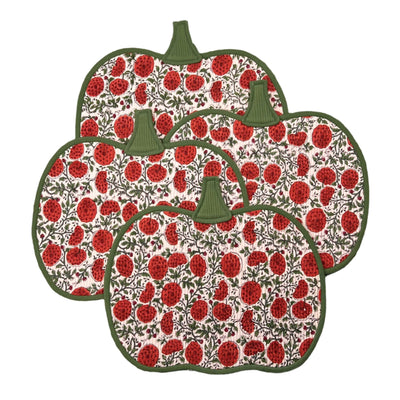 This set of four pumpkin-shaped placemats, in rich burnt reds and a blend of sublime greens, brings warmth to any table. Featuring a contrasting green border, these reversible, quilted placemats are handmade with care, making them perfect for cozy autumn and winter gatherings. Ideal for family meals, they add a festive and inviting touch to any seasonal table setting.