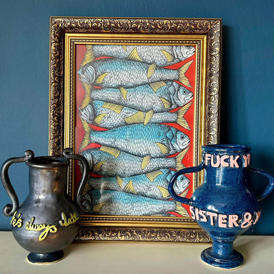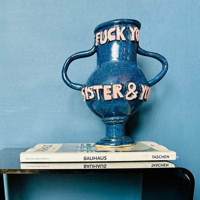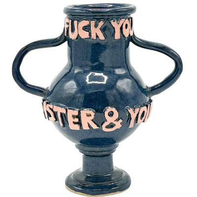 The F**** You Vase is a signature style for L&Clay Ceramics, featuring a spherical body and circular rim. 3D sprig letters read "F**** you and your sister and your mom and your job" in salmon pink on a fjord blue surface. Add yours to any room for a bold pop of colour.  Stoneware Clay with Slip and Glaze. Made in 2024. Measurements: Height 25cm Diameter 14cm  Each piece is handmade, un-symmetrical, beautifully wobbly and always unique.
