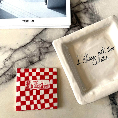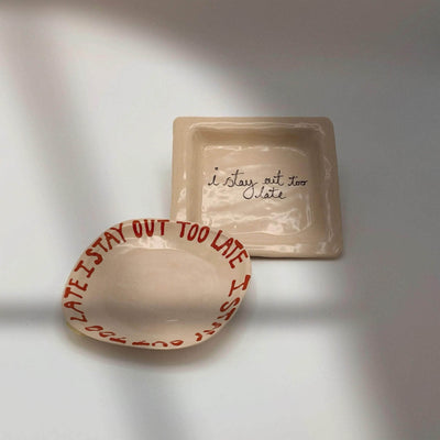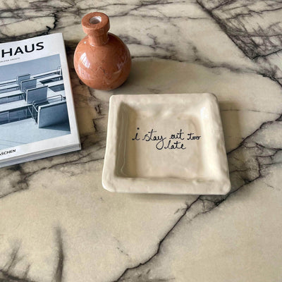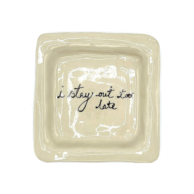 The I Stay Out Too Late Trinket Tray is a signature style for L&Clay Ceramics. A cream square ceramic tray for your keys, jewellery and trinkets, featuring text in black that reads "I Stay Out Too Late". Each piece is handmade and will differ slightly from the image, remaining unique and beautifully wobbly.