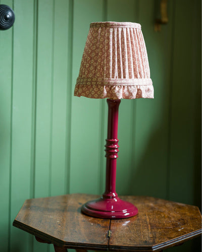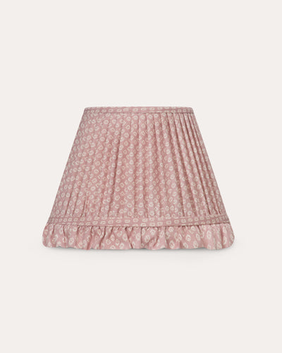 A gathered lampshade trimmed with a frill made from 100% linen in Old Rose – a beautiful small-scale floral motif in soft ivory, arranged in a rhythmic repeat across a dusky pink base. The crispness of the linen enhances the detail of the design, giving the fabric a fresh yet timeless character.
