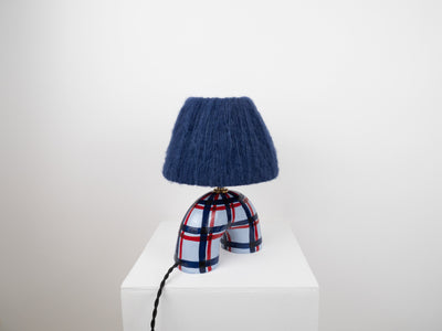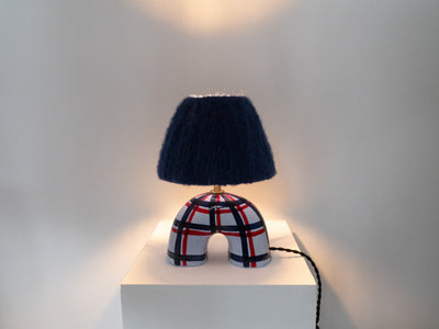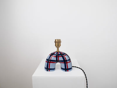 A playful yet refined addition to any room, this handmade ceramic lamp features a sculptural arched base hand-painted in a light blue, navy and red gingham pattern. The glossy glaze enhances the richness of the colours and gives the surface a smooth, light-catching finish. It’s paired with the signature wool lampshade in a matching deep blue colour, whose soft texture contrasts beautifully with the shine of the ceramic base.