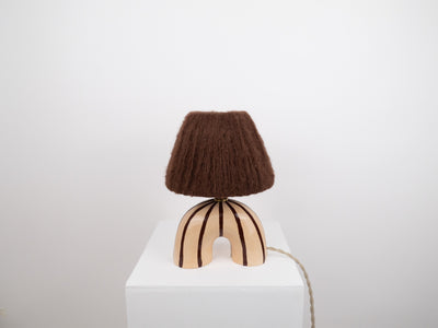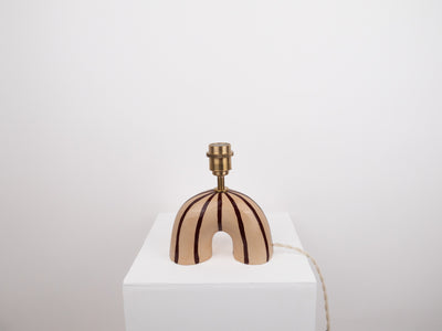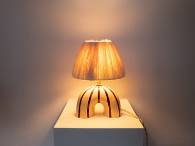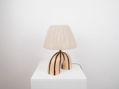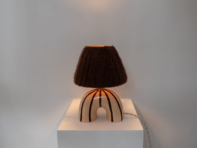 A playful yet refined addition to any room, this handmade ceramic lamp features a sculptural arched base, hand-painted in cream, with brown stripes. The glossy glaze enhances the richness of the colours and gives the surface a smooth, light-catching finish. It’s paired with our signature wool lampshade. Choose between a cream or a brown lampshade for this lamp. The soft texture contrasts beautifully with the shine of the ceramic base.