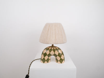 A playful yet refined addition to any room, this handmade ceramic lamp features a sculptural arched base, hand-painted in cream, with mossy green stripes. The glossy glaze enhances the richness of the colours and gives the surface a smooth, light-catching finish. It’s paired with the signature wool lampshade in a cream colour, whose soft texture contrasts beautifully with the shine of the ceramic base.