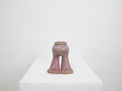 The 'Tootsie' vase series has a thrown vase added to two hand-built legs and feet. The result is a playful and unique form. This 'Tootsie' vase has been decorated by layering glazes to create a hue of pink and white tones.