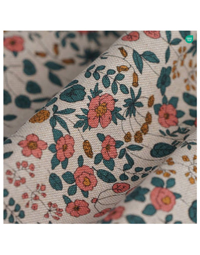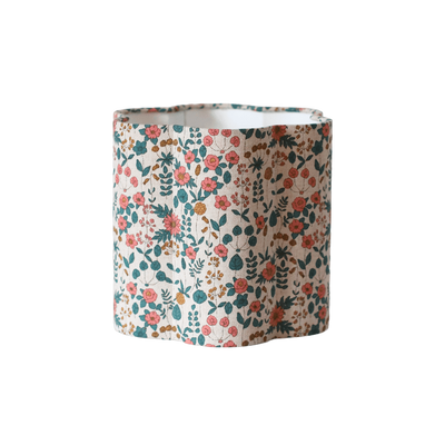 Crafted from a delicately floral fabric, it adorns a scalloped-edged structure that subtly evokes flower petals. On a soft beige background unfolds a rich pattern of small flowers and leaves in harmonious shades of pink, ochre, and forest green, bringing timeless bucolic charm.
