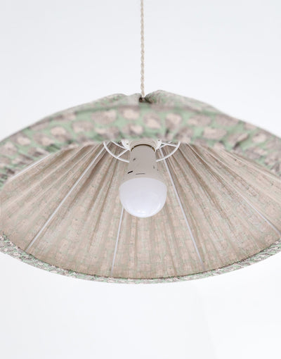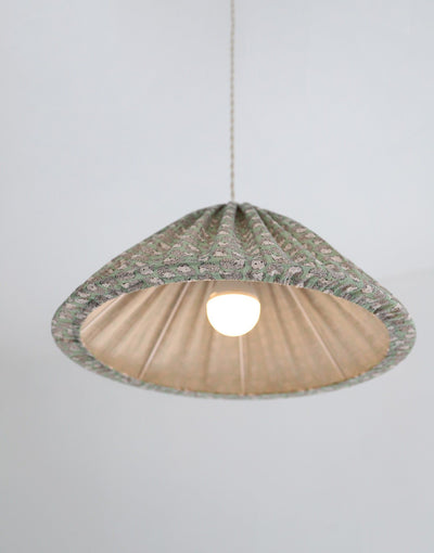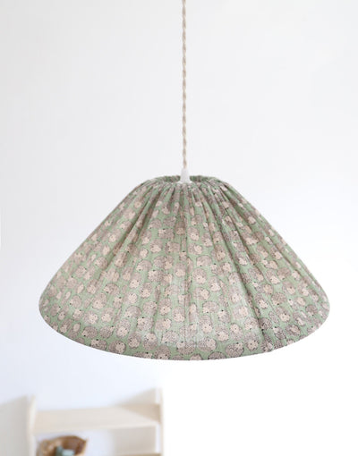 This delicately printed pendant light features a conical shade wrapped in double cotton gauze decorated with tiny hedgehogs on a soft green background. The fabric diffuses a gentle, enveloping light, blending timeless charm with modern elegance. Perfect for a dining room, bedroom, or cozy corner, it creates a warm and welcoming atmosphere.