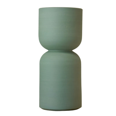 This contemporary, diablo shaped, vase has been hand thrown in a sage green coloured clay and glazed with a transparent gloss on the interior.