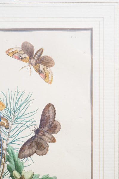 This is an original antique framed illustration of moths. The etchings have been hand coloured and depict each stage of pupation. The beautiful illustrations of the flora and fauna have been hand coloured in watercolour and have retained their rich pigments.