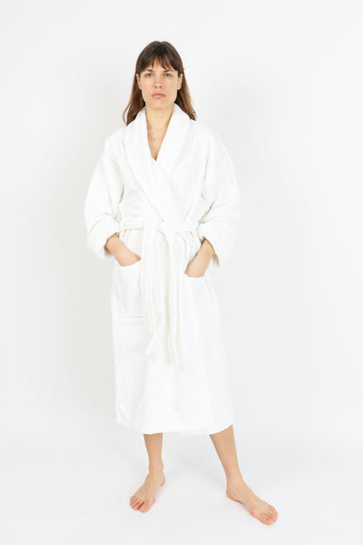 House Babylon’s bathrobe is crafted from organic Turkish cotton and is Oeko-Tex certified to be fully free of any harmful chemicals. The terrycloth bathrobe is made of 450 GSM long cotton fibers for maximum fluffiness and absorbency. This unisex bathrobe offers a relaxed fit featuring a lapel and capacious pockets. Made in Turkey.