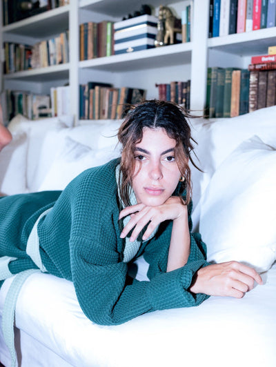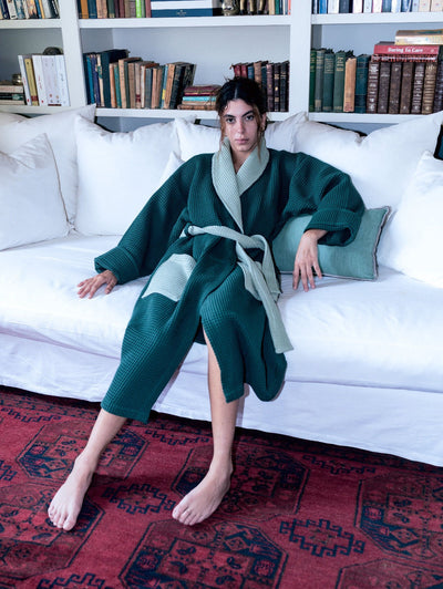 House Babylon’s two toned waffle bathrobe is crafted from organic Turkish cotton and is Oeko-Tex certified to be fully free of any harmful chemicals. The waffle bathrobe is lightweight, softly textured and woven at 230 grams per square meter. This unisex bathrobe offers a relaxed fit featuring a lapel and capacious pockets. Made in Turkey.