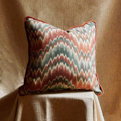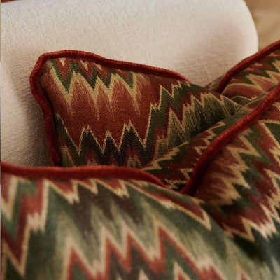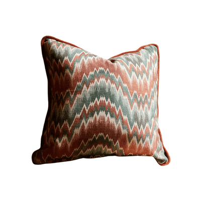 Pillow with an original cotton fabric with herringbone design in oranges by Quintana Partners in collaboration with Güell Lamadrid. Topped with an elegant velvet cord.