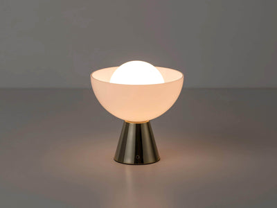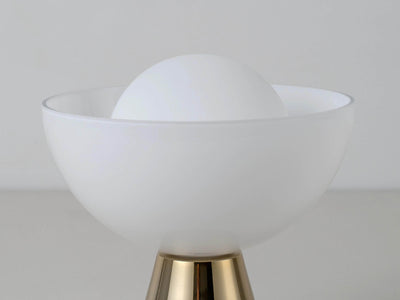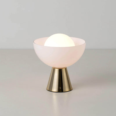 Stay ahead of the curve with our rechargeable glass dome table lamp. Proof that you can combine practicality and style, this cordless lamp is multi-functional, can be moved from room to room as the perfect lighting solution. The glowing glass shade set within a milky glass dome is balanced on a polished brass base that can be transported around the home with you.