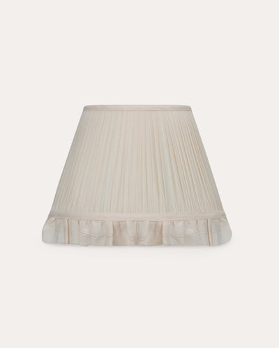 A very pretty frilled lampshade with fine lines of delicate embroidery running vertically down the folds of cotton before swapping direction along its ruffled trim. Coloured in Daisy, its warm white tones make it easy to bring into any and every colour palette.Being lined in white organic cotton adds a pleasing weight and means the light doesn’t come through too harshly. The embroidery allows the slightest shafts of light through too giving off a balanced, ambient glow.The table lamp design can also be used as a wall light, and it also comes as a pendant light shade for ceiling fixtures.