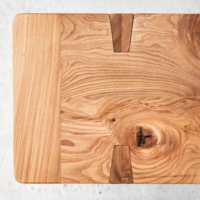 Inspired by classic farmhouse dining, the Sylvan bench marries a rustic, truss-style structure with a lightweight form.  Bringing a contemporary touch to a timeless design, this bench is the perfect seating accompaniment to our Sylvan table. The top features breadboard ends which runs cross-grain to the main panel, adding both stability and character. The shaped, tapered legs, set into the surface of the bench, further add to the mix of contrasting grain patterns. The Sylvan bench is made from solid British wood, in your choice of elm (pictured), ash, oak or walnut, sourced locally from trees that have been felled due to urban development or weather damage.