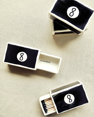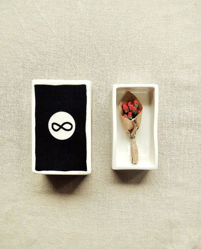 The design mimics a traditional matchbox, consisting of an outer box and an inner sliding drawer. While perfect for storing matches, the drawer also transforms the piece into a delicate jewelry box or a safe haven for your small treasures. To complete your piece, Ini offer optional add-ons: you can choose between red or black 7.5 cm matches, or a bouquet of paper roses. As each item is artisanally made, slight variations in pattern and shape are to be expected—subtle details that reflect the authenticity and uniqueness of our craftsmanship. Please note:  - This piece is in stock, which means your order will be shipped within 3 days! - This is a decorative object that also functions as a real matchbox, featuring a strike strip on one side of the inner drawer. DETAILS: - Porcelain fired at high temperatures. - Transparent shiny glaze, harmoniously paired with hand-drawn illustrations. - Built-in strike strip for match lighting.