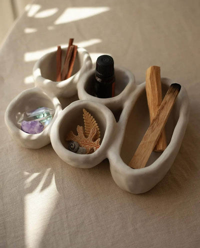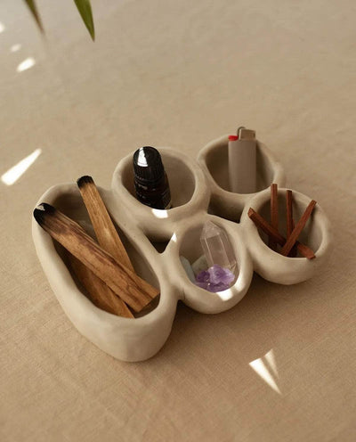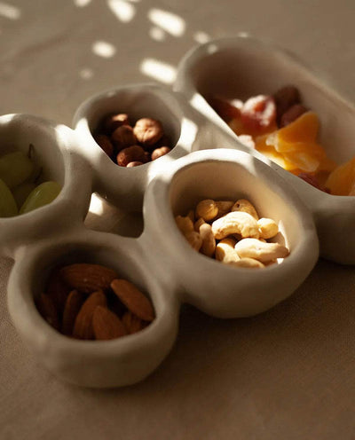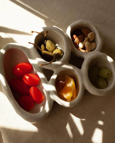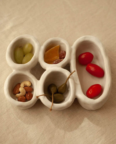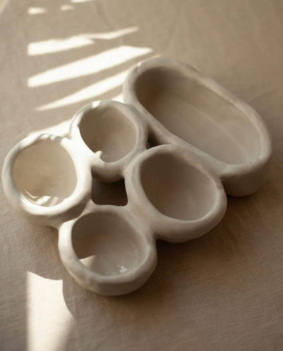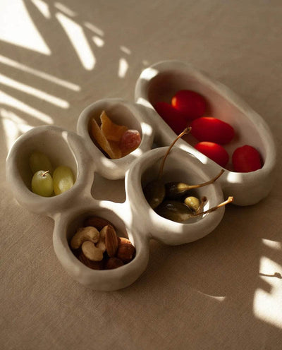 The 'Organic Fusion N°4' plate is a versatile and functional piece that goes beyond traditional tableware. It features five small plates or bowls seamlessly attached together during the production process. This innovative design allows for various uses, whether serving food, storing jewelry, presenting spices, or even as a trinket bowl. This handmade plate beautifully blends organic inspirations with skilled craftsmanship. Stoneware fired at high temperature finished with original cream glaze. Handmade in Ini Ceramique's studio in France. Since each piece is unique and handmade, the shapes and glazes patterns may slightly differ from one cup to another.