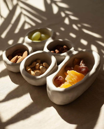 The 'Organic Fusion N°4' plate is a versatile and functional piece that goes beyond traditional tableware. It features five small plates or bowls seamlessly attached together during the production process. This innovative design allows for various uses, whether serving food, storing jewelry, presenting spices, or even as a trinket bowl.