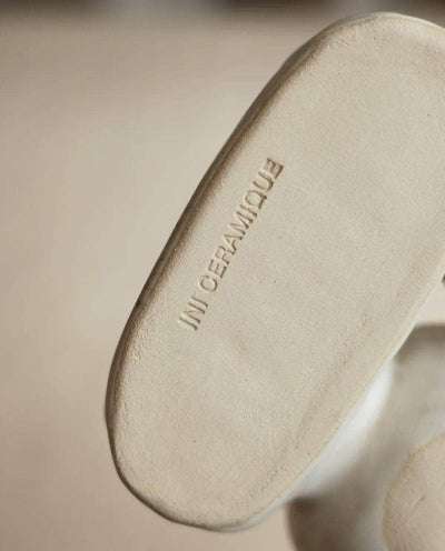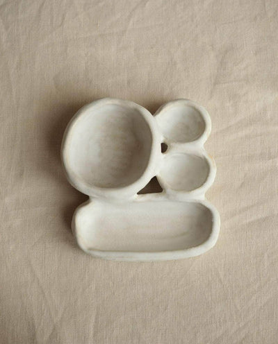 The 'Organic Fusion N°6' plate is a versatile and functional piece that goes beyond traditional tableware. It features several small plates or bowls seamlessly attached together during the production process. This innovative design allows for various uses, whether serving food, storing jewellery, presenting spices or eggs, or even as a trinket bowl. This handmade plate beautifully blends organic inspirations with skilled craftsmanship. - Stoneware fired at high temperature finished with original cream glaze. - Handmade in our studio in France. Since each piece is unique and handmade, the shapes and glazes patterns may slightly differ from one cup to another. - Please note that due to the light colour finishing subtle marks may appear, showcasing in a nice way the effect of time.