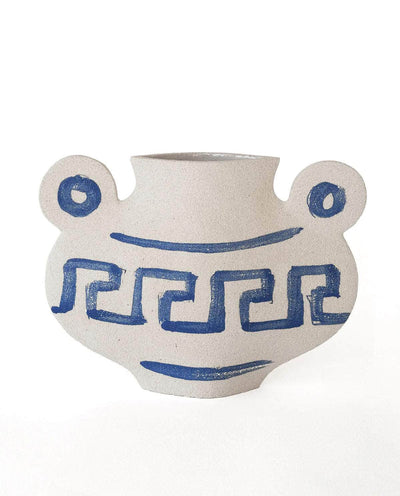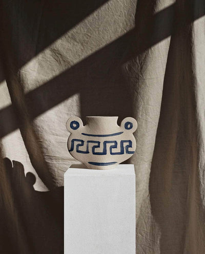 Kindly be advised that, as a result of high demand Ini Ceramique's current lead time has been extended to 45 days. A part of a captivating new line blending ancient Greek pottery with contemporary design, the ‘Greek [M]’ vase showcases delicate blue underglaze illustrations that harmonize traditional and modern aesthetics. Crafted by our designer, the blue underglazes are meticulously applied by hand before the initial firing, infusing the vase with a touch reminiscent of antiquity. After a second firing at 1250°C, a transparent glaze is added to the interior for a refined finish, ensuring lasting durability. As each piece is artisanal, decorative patterns and shapes may vary subtly, highlighting the authenticity that defines our craftsmanship. DETAILS: - Stoneware fired at high temperatures, finished with a glossy transparent glaze on the interior. - Raw exterior showcasing the natural texture of the clay, harmoniously paired with hand-painted blue underglaze motifs (applied on one size of the vase).