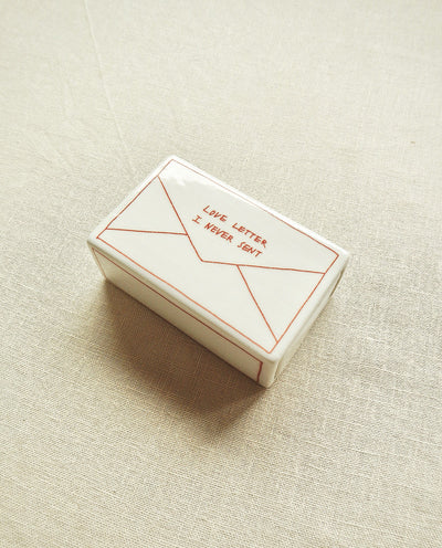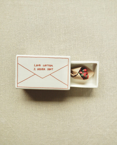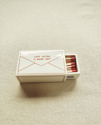 The design mimics a traditional matchbox, consisting of an outer box and an inner sliding drawer. While perfect for storing matches, the drawer also transforms the piece into a delicate jewelry box or a safe haven for your small treasures. To complete your piece, we offer optional add-ons: you can choose between red or black 7.5 cm matches, or a bouquet of paper roses. As each item is artisanally made, slight variations in pattern and shape are to be expected—subtle details that reflect the authenticity and uniqueness of our craftsmanship. Please note:  - This piece is in stock, which means your order will be shipped within 3 days! - This is a decorative object that also functions as a real matchbox, featuring a strike strip on one side of the inner drawer. DETAILS: - Porcelain fired at high temperatures. - Transparent shiny glaze, harmoniously paired with hand-drawn illustrations. - Built-in strike strip for match lighting.