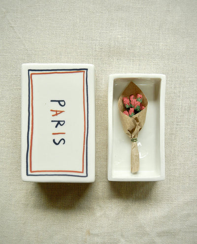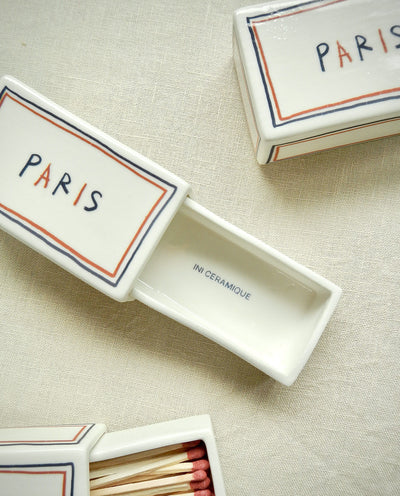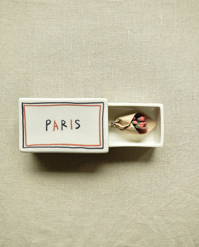 The design mimics a traditional matchbox, consisting of an outer box and an inner sliding drawer. While perfect for storing matches, the drawer also transforms the piece into a delicate jewelry box or a safe haven for your small treasures. To complete your piece, Ini offer optional add-ons: you can choose between red or black 7.5 cm matches, or a bouquet of paper roses. As each item is artisanally made, slight variations in pattern and shape are to be expected—subtle details that reflect the authenticity and uniqueness of our craftsmanship. Please note:  - This piece is in stock, which means your order will be shipped within 3 days! - This is a decorative object that also functions as a real matchbox, featuring a strike strip on one side of the inner drawer. DETAILS: - Porcelain fired at high temperatures. - Transparent shiny glaze, harmoniously paired with hand-drawn illustrations. - Built-in strike strip for match lighting.