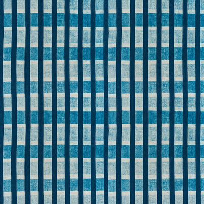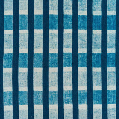 Lino stripe. Thin check stripe, created with overlaying rectangles. In homage to the colours and patterns of Northern Italy. White rectangles printed onto indigo linen.