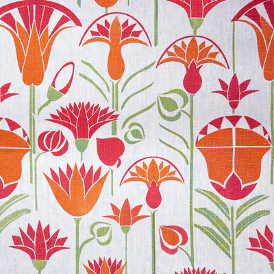 This Lotus design is made up of orange and magenta flowers printed onto off white. Each flower shows the lotus in a different stage of its daily cycle.