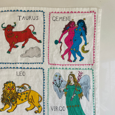 These stonewashed linen tea towels are finished to a beautiful standard and feature a playful take on the star signs. Inspired by 15th century alchemical drawings, they have been modernised to reflect the whimsy and joy of opening up the horoscope on a Sunday morning. It is both functional and fun, with literally something for everyone.  Perfect as a dinner party gift, a housewarming present, or a cheerful pop of colour in your kitchen. Each one is handmade with care in a limited run, so they feel as special as they look. Thoughtful, practical, with a touch of whimsy: Josephine Dessine.