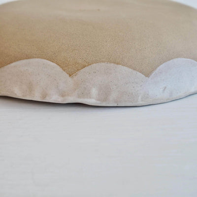 Handmade large flat ceramic stoneware  fruit / serving bowl decorated inside  with glazed illustrated fruits  on a cream background, the fruits have touches of gold leaf and the underside  has a wavy scalloped glazed edge.